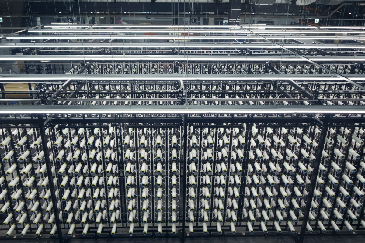 ファクトリーの二階には、繊維の特徴や製造方法などを学ぶ展示があり、工場を見下ろすことができるスペースが続きます。24時間稼働する織機が数百台並ぶ壮観な生産現場を窓越しに見学できるほか、現場の音や湿度、匂いが体感できるように窓のないライブビューイングのテラスもありました。
