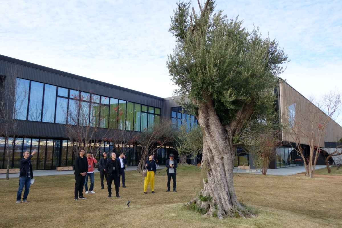 ツアーは屋外の施設からスタートしました。当日は天気が良く、高台にある施設からは白山や立山まで見渡すことができました。庭は一般にオープンにしているパブリックスペースで、プラントハンター・西畠清順さんが造園。イタリアの樹齢約1000年のオリーブなどの植栽があります。エントランス手前にあるオブジェは、建築家で陶芸家の奈良祐希さんがデザインしたパブリックアートで、開設時の従業員数と同じ331本のカーボンワイヤーで作られています。